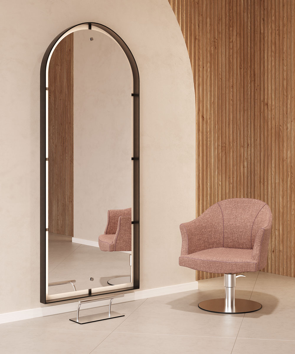 Arcadia is the full-length mirror ideal for professional environments that demand style, functionality, and attention to detail. The arch-shaped mirror with anti-shatter film is enhanced by a refined embossed matte black metal frame, supported by a sturdy wooden panel.