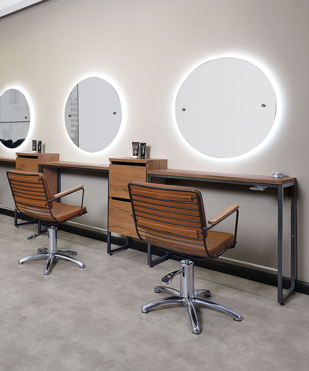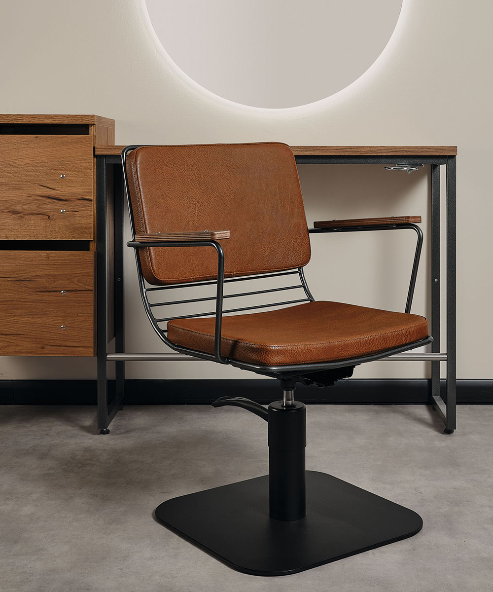 Salon Ambience chairs are available with three types of base — five-star, round or rounded — in standard or black finish, and can be equipped with either a swivel column or a brake pump. The pump is 100% Made in Italy and comes with a 5-year warranty.