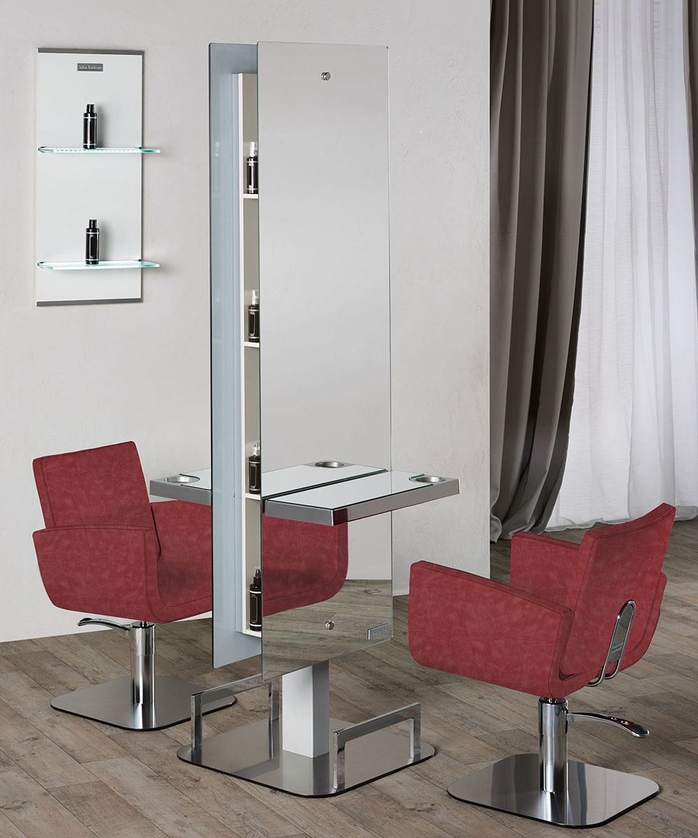 The Lunar styling mirror is also available as an island unit, with a simple, space-saving column support by a stylish base with rounded edges. Useful product shelves can be found In between the two mirrors, with the structure in white ash melamine.