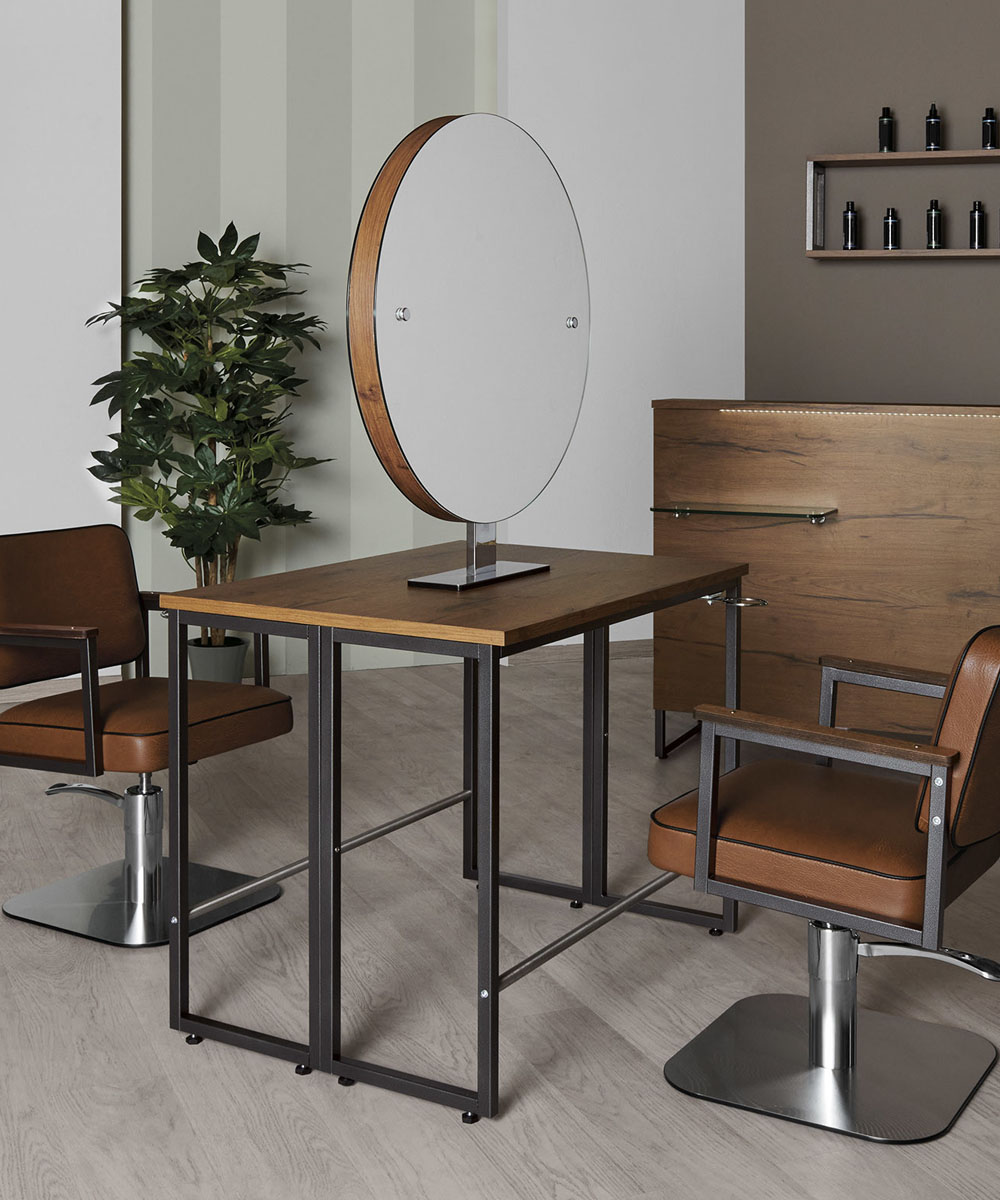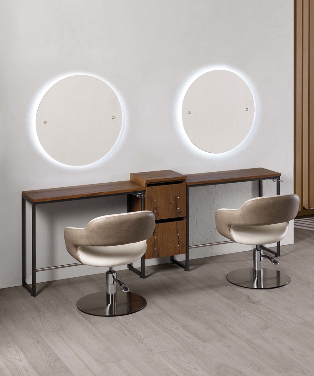 The London mirror consists of an anthracite metal structure and a melamine top available in different finishes, for an extremely contemporary industrial style. The London is available in both wall mirror and island unit versions. On top of that, the London comes with either round or rectangular mirrors, for either classic or minimal look.