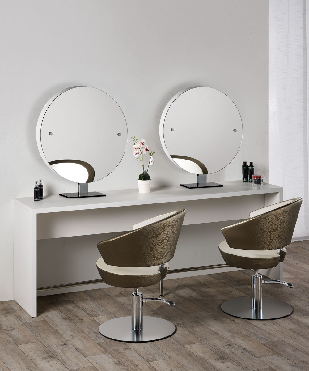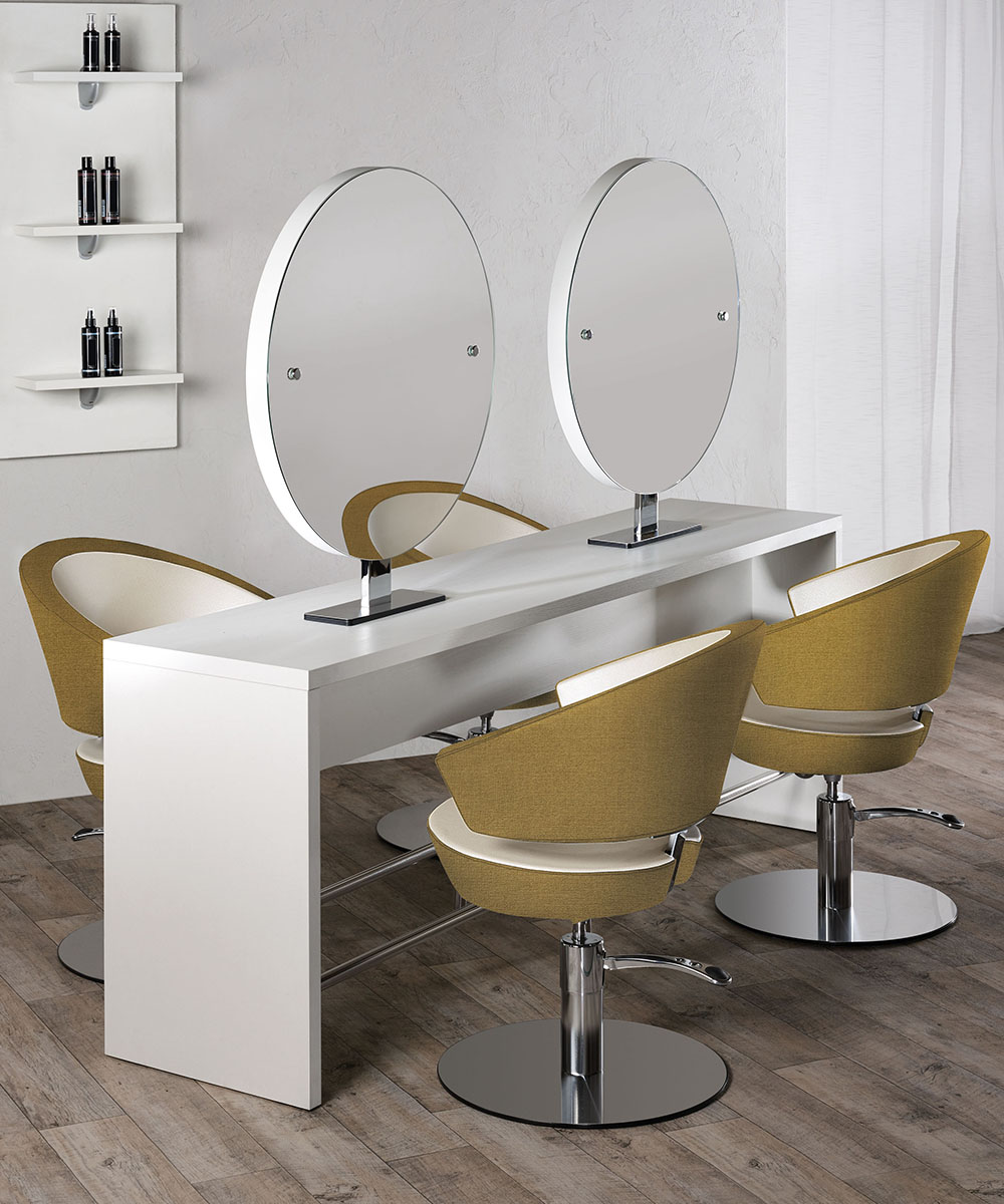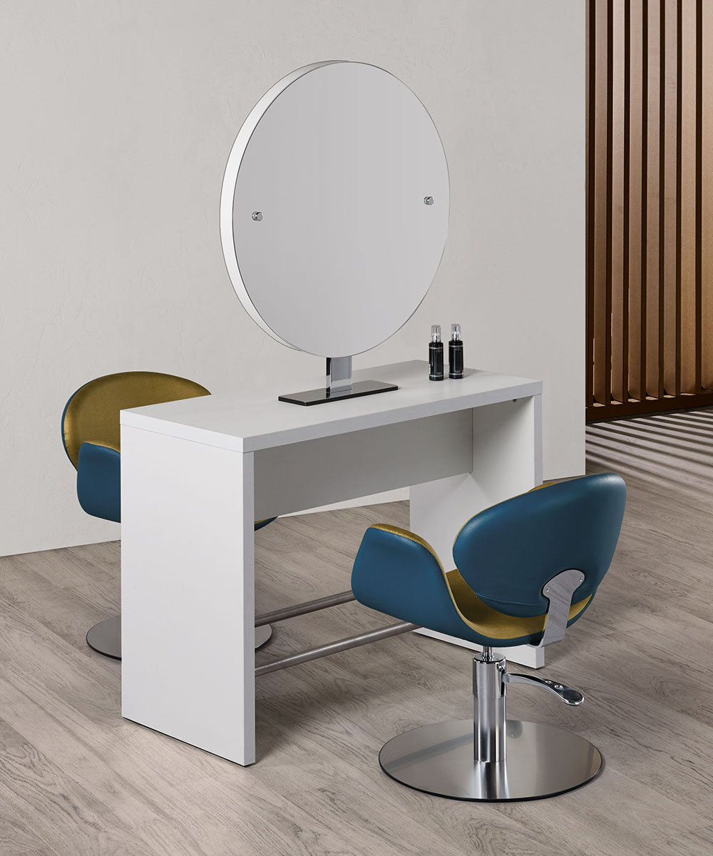 The Brooklyn was born to amaze! The customizable and eye-catching workunit comes with simple and essential shapes of the white ash melamine structure, and is available in four versions: single or double wall mirror, and two or four position island unit. On top of that, the Brooklyn comes with either round or rectangular mirrors. If you are looking for a refined taste, the round mirror is the one for you. If you prefer the pure geometries instead, choose the rectangular mirror, which has plenty of space to store the products.