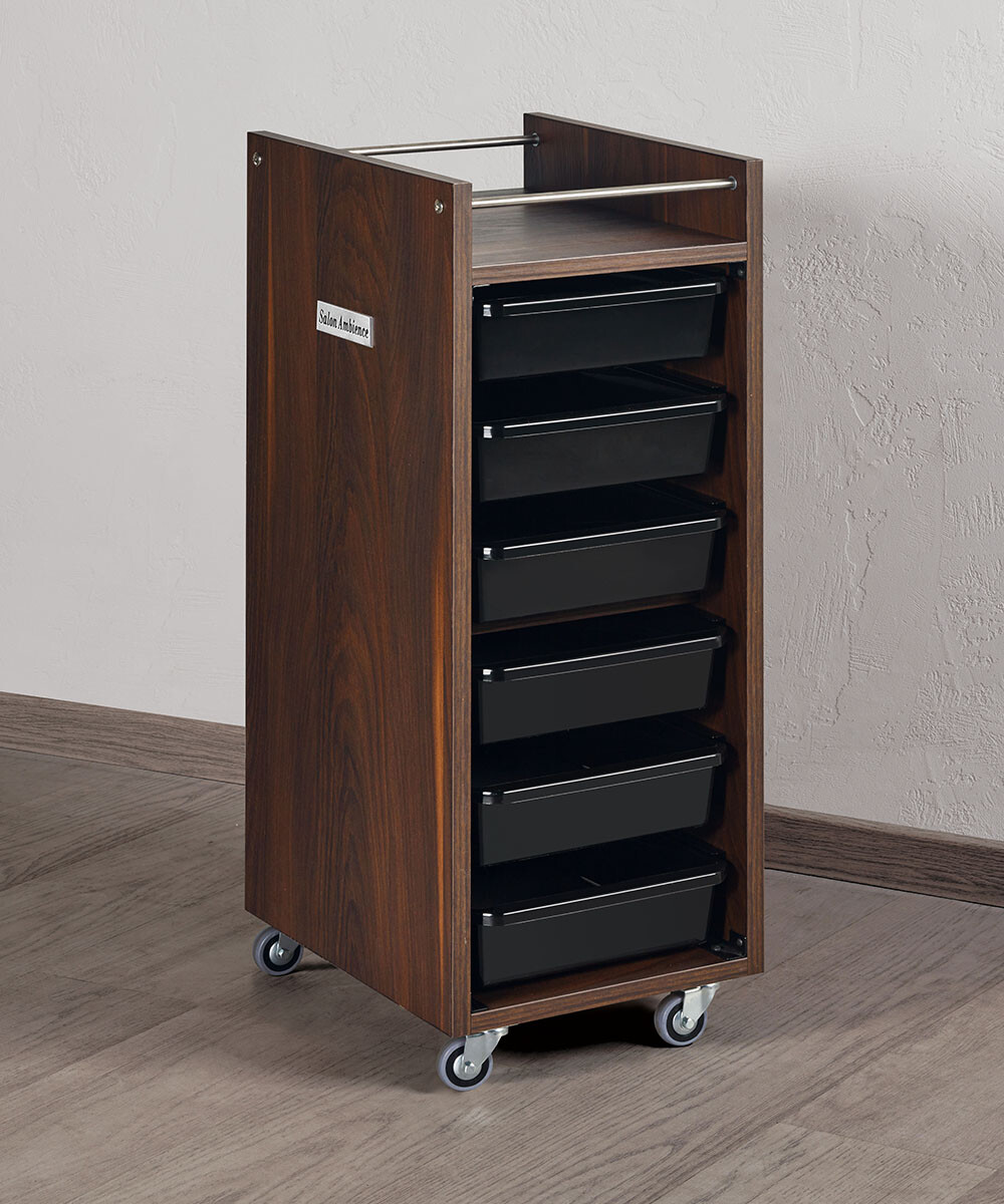 Il carrello Glam, pratico e indispensabile, è dotato di 6 vaschette porta prodotti removibili in plastica, di ruote e porta phon incluso. Disponibile e personalizzabile in diverse finiture senza costi aggiuntivi.