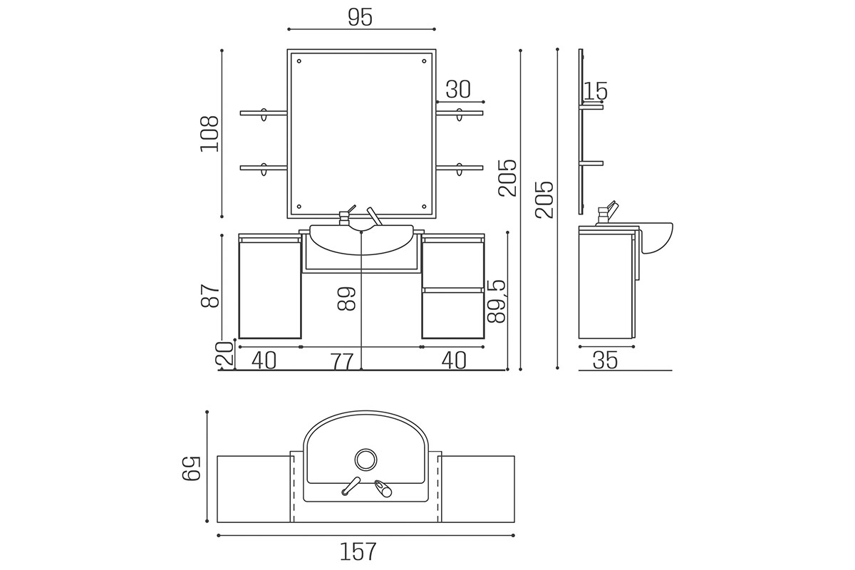 Sollevata dal pavimento, per rendere la pulizia rapida ed efficace, Monza è modulare e componibile con due mobili laterali, uno con anta e l'altro con cassetti ed è sormontata da un’ampia specchiera con quattro ripiani laterali.
