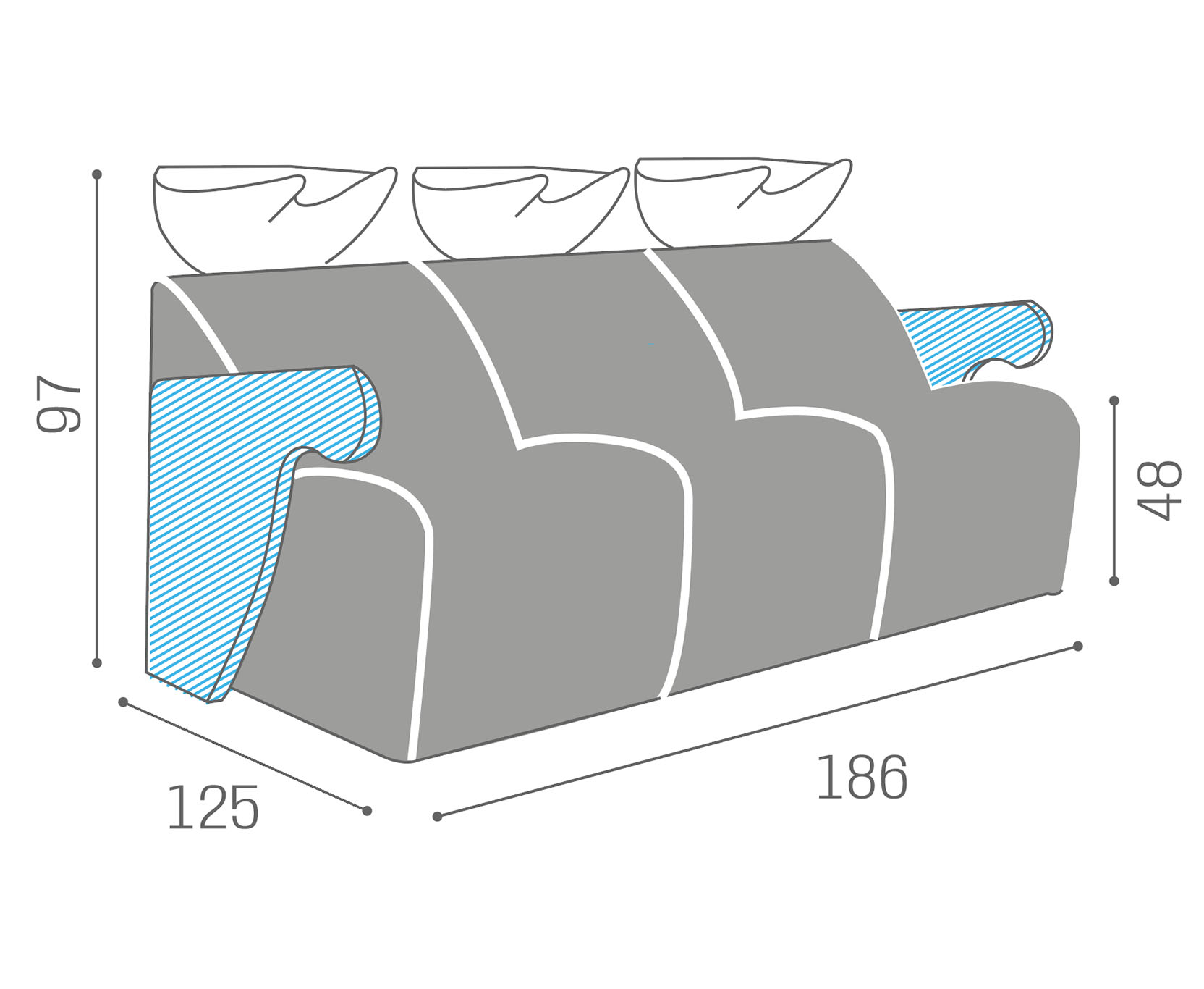 WU/830/N Lunawash, lavatesta a tre posti con ceramica nera