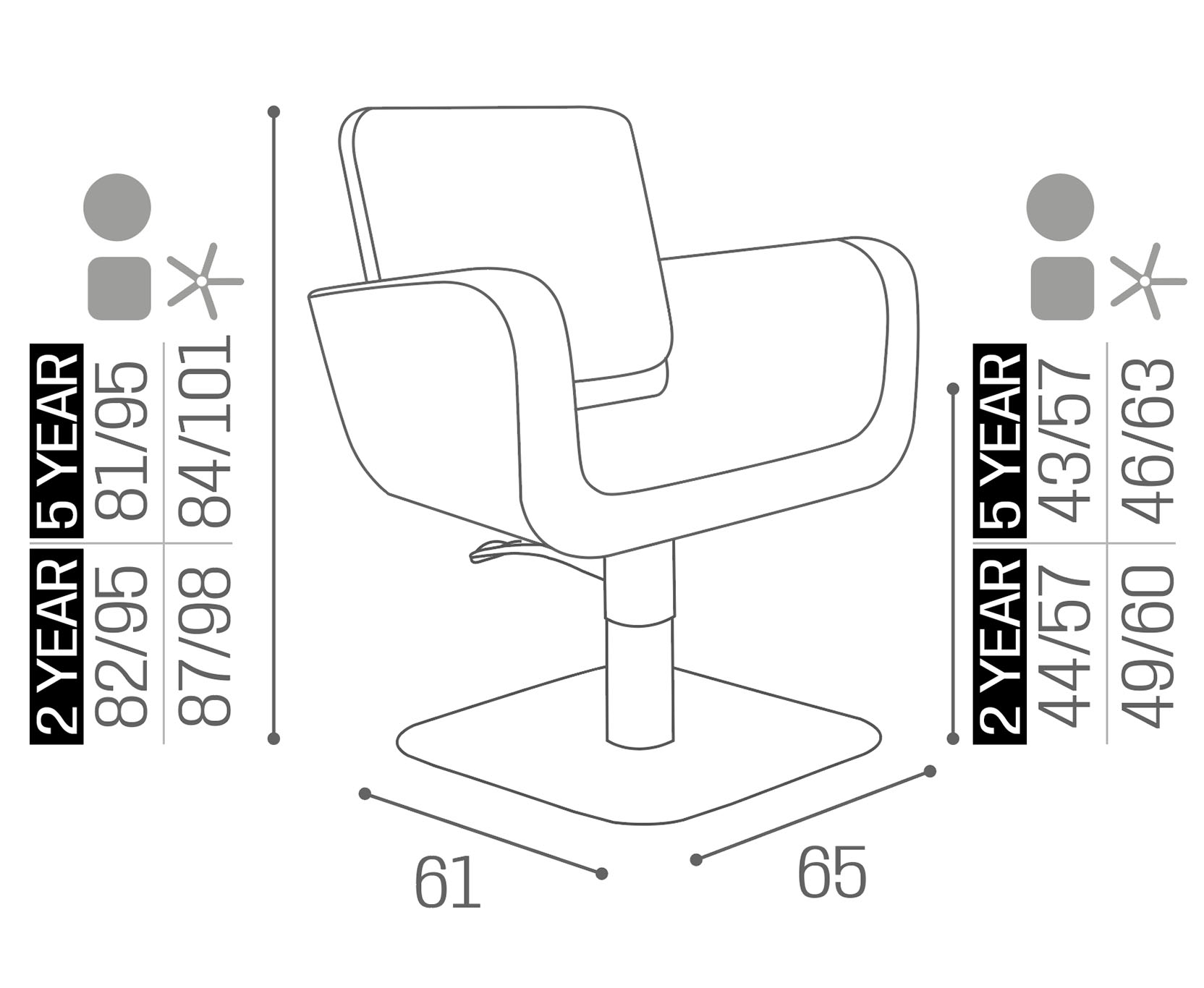 Le poltrone Salon Ambience sono disponibili con tre tipi di base — a cinque razze, rotonda o stondata — in finitura standard o nera, e possono essere dotate di colonna girevole oppure di pompa con freno. La pompa, 100% Made in Italy, è garantita 5 anni.