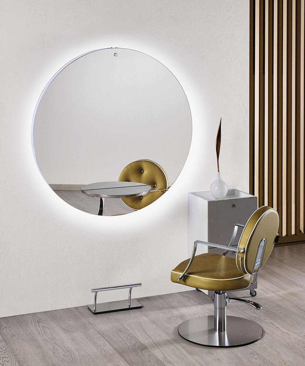 Planet, la specchiera Salon Ambience dallo stile unico e maestoso, è la vera protagonista del tuo salone. Grazie al suo design moderno e minimale, e all’imponente specchio di forma circolare, Planet, nella sua versione a parete, emana fascino ed eleganza, ideale per saloni dal gusto ricercato, che vogliono distinguersi per raffinatezza. Il tocco speciale è dato dalla cornice dello specchio: elegantemente illuminata a LED RGB consente di giocare con una gamma multicolore per creare la giusta atmosfera nel salone e coccolare il cliente con la cromoterapia. Lo stile di Planet è completato da eleganti e pratici pianetti in alluminio o in legno, provvisti di porta phon.