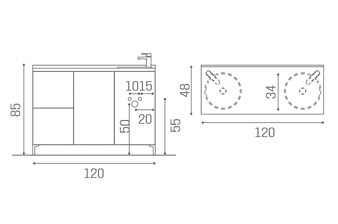 WS/085 Wall System, 120 cm backwash cabinet with doors, drawers and basin on the left