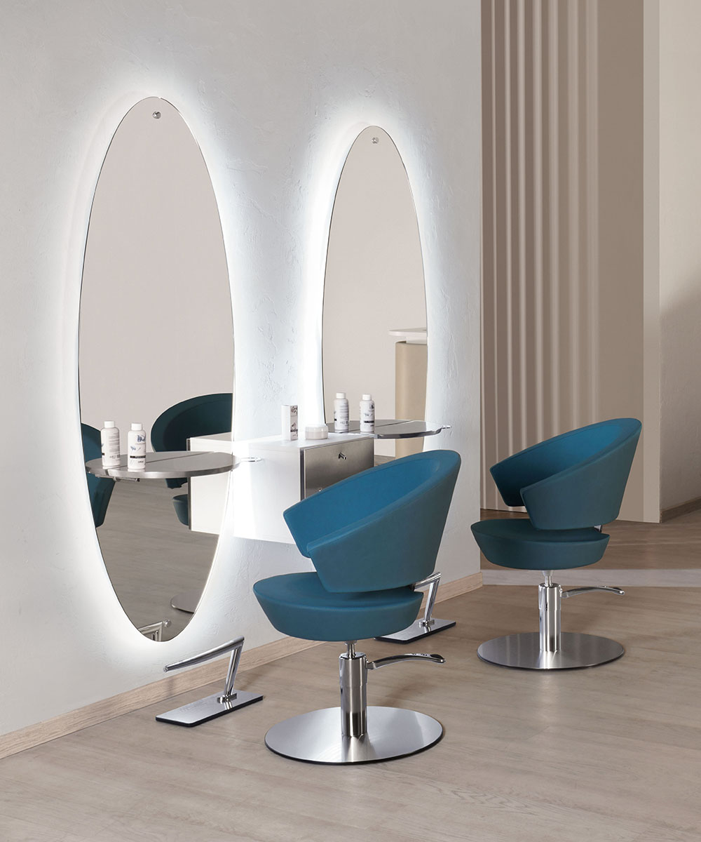 Salon Ambience chairs are available with three types of base — five-star, round or rounded — in standard or black finish, and can be equipped with either a swivel column or a brake pump. The pump is 100% Made in Italy and comes with a 5-year warranty.