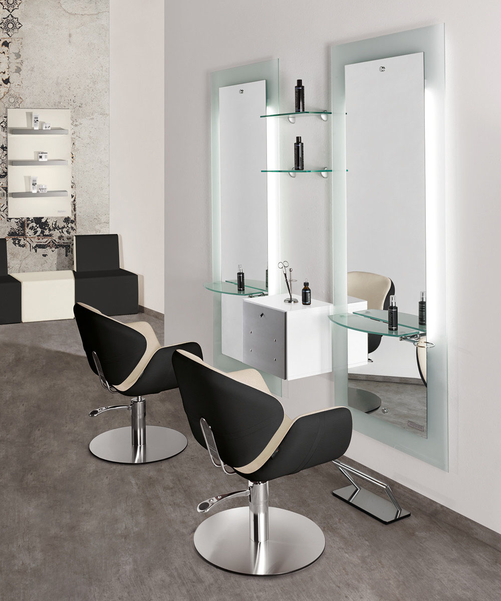 Salon Ambience chairs are available with three types of base — five-star, round or rounded — in standard or black finish, and can be equipped with either a swivel column or a brake pump. The pump is 100% Made in Italy and comes with a 5-year warranty.