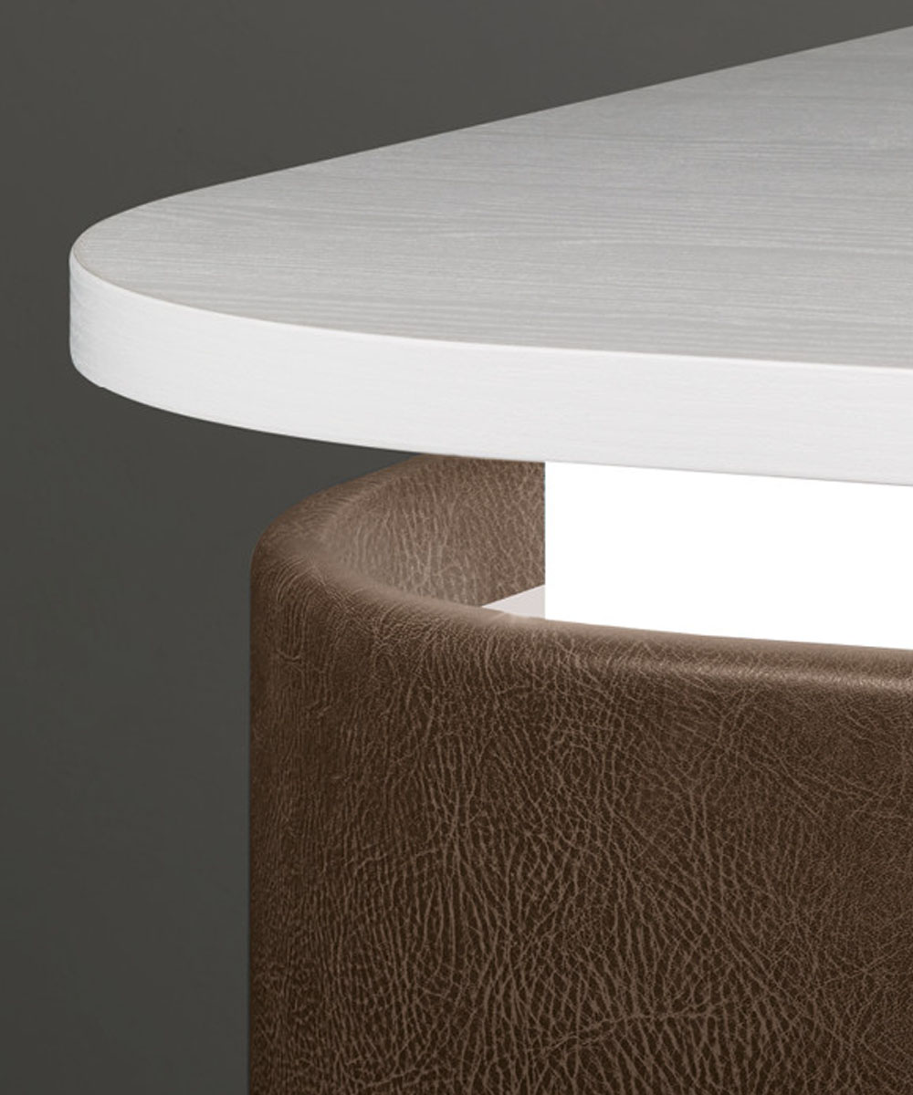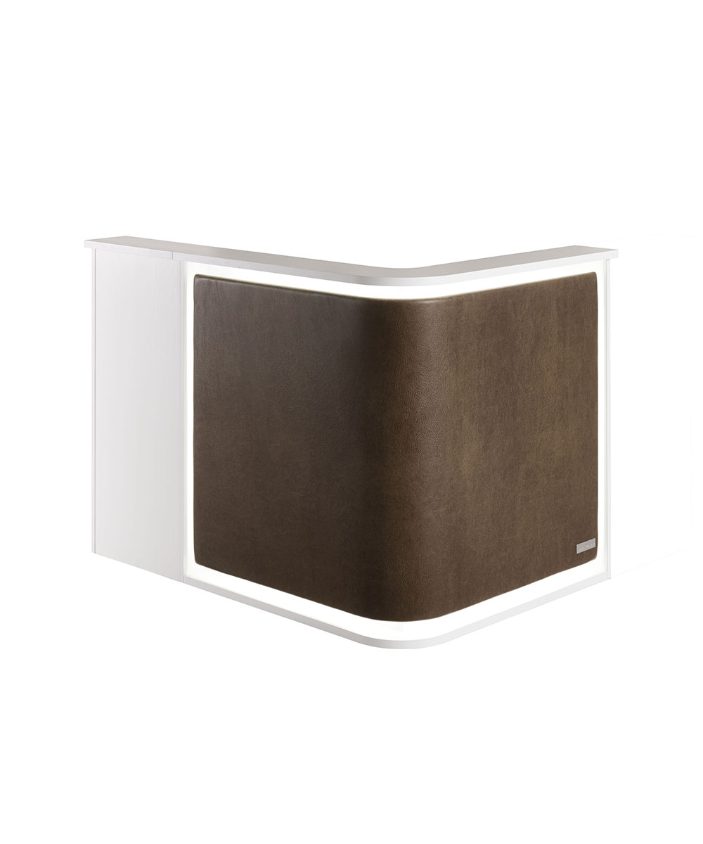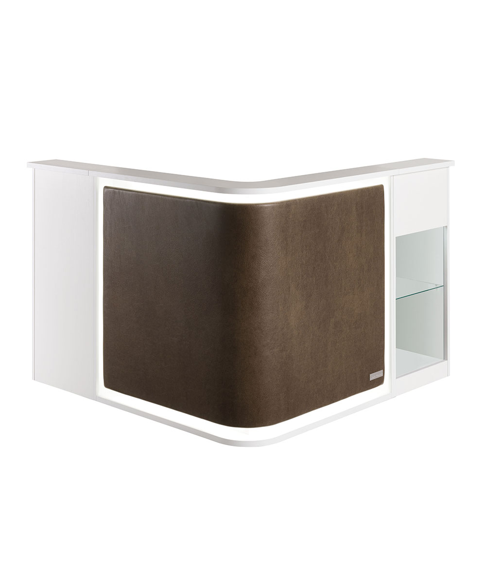 The Smart choice for the reception area has arrived! This stylish reception desk in white ash melamine commands attention upon entering the salon, with an upholstered front panel (available in a wide choice of colours) that curves at a 90° angle, allowing for the desk to be positioned in different ways, while still being compact enough to create extra space in the reception area. LED lighting beautifully accentuates the form of the upholstered front panel, while also adding importance to the reception desk. The Smart is also available with side display cabinets and side storage cabinets (also available separately).