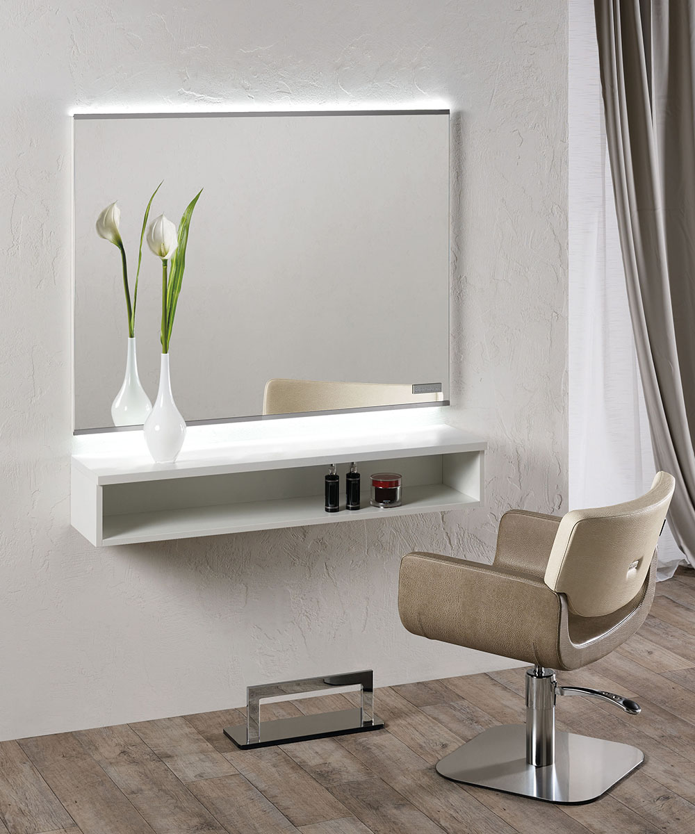 Erweitern Sie Ihren Horizont mit dieser fesselnden Styling-Einheit! Der Horizon von Salon Ambience bietet einen Spiegel, der sowohl imposant als auch minimalistisch ist, mit LED-Hintergrundbeleuchtung und Aluminiumbordüren, die den raffinierten Stil des Horizon vervollständigen. Darunter befinden sich ein großes Arbeitsregal und ein Produktlagerbereich aus weißem Melamin, die die Größe und Bedeutung des Spiegels selbst ergänzen. Der Horizon wird auch mit einer großen Fußstütze geliefert, die den minimalistischen Stil der Arbeitseinheit fortsetzt. Horizon ist in verschiedenen Materialien erhältlich.