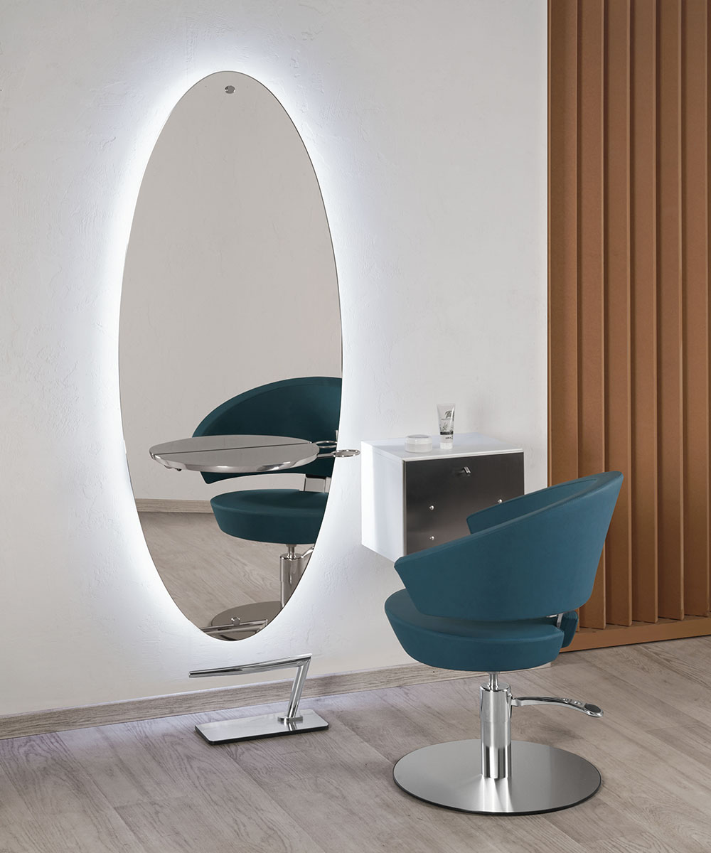 Mercury, der elliptische Spiegel mit einem sauberen und minimalistischen Look, perfekt, um jedem Salon einen Hauch von Stil und Eleganz zu verleihen und für alle Möbelstile geeignet. Mercury ist mit RGB-LED-Beleuchtung ausgestattet, die in Farbe und Intensität einstellbar ist und komplett mit Arbeitsablage und Haartrocknerhalter geliefert wird. Die Ablagen sind erhältlich in Aluminium oder in den Materialien Vintage Wood 01, Black Ash 02 und Cement Grey 03. Der Mercury ist als Single-Wandversion oder als Insel-Doppelplatz erhältlich.