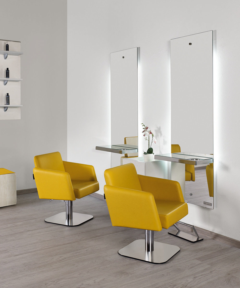 Salon Ambience chairs are available with three types of base — five-star, round or rounded — in standard or black finish, and can be equipped with either a swivel column or a brake pump. The pump is 100% Made in Italy and comes with a 5-year warranty.