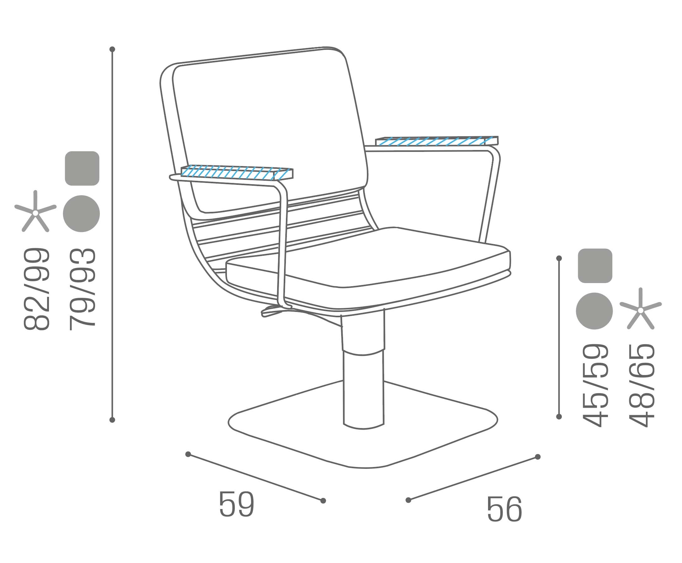 Salon Ambience Stühle sind mit drei verschiedenen Fußgestellen erhältlich – mit fünfstrahligem, rundem oder abgerundetem Design – in Standard- oder schwarzer Ausführung, und können wahlweise mit Drehkolonne oder Bremspumpe ausgestattet werden. Die Pumpe ist zu 100 % Made in Italy und hat 5 Jahre Garantie.